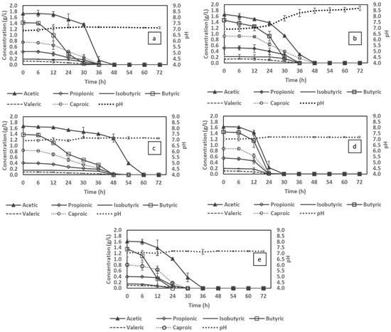 The effect of different cultivation factors (compared in pairs) on volatile fatty acid (VFA) consumption: pH control (a) vs. no pH control (b); C/N 6 (a) vs. C/N 12 (c); 1 vvm (a) vs. 0.25 vvm (d) and ammonium sulfate (a) vs. urea (e).