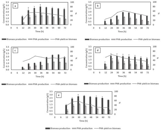 As depicted in Figure 4a,d, C/N ratio had a noticeable impact on bacterial growth and PHA accumulation. In particular, excessive nitrogen deficiency (C/N 12) limited biomass production, the maximum amount of which was only 2.1 g/L compared with 2.8 g/L for C/N of 6. This finding is in agreement with the results achieved by Zhou et al. [52], where nitrogen-insufficient conditions are preferred for secondary metabolism of PHA production and concomitantly reducing cell growth. Although the highest PHA content obtained for C/N 12 was 1.4 g/L (approximately 6% lower than that of C/N 6), this nitrogen-insufficient condition provided the highest maximum PHA yield on biomass of 65.1% at 24 h, reaching the maximum 6 h earlier compared to the condition of nitrogen surplus of 55.7%. The higher PHA yield in nitrogen deficient condition could be ascribed to the lower biomass produced while the accumulated PHA was considerably different. Biomass production and PHA accumulation, therefore, should be balanced to achieve a high PHA production per bacterial mass. This approach is consistent with the results of Sangkharak and Prasertsan [53], where a C/N ratio of 6 provided the highest PHA content, the amount of which declined in extreme high or low C/N ratios. The result obtained indicated the influence of C/N ratio on the rate of PHA production since the condition with high nitrogen concentration experienced a long lag before entering the condition of nitrogen deficiency. In the case of nitrogen deficiency, the proton gradient is affected, which inhibits the Acetyl-CoA to TCA cycle for the synthesis of ATP. The excess acetyl-CoA is then directed to PHA synthesis [54]. The time required to achieve maximum PHA content is therefore different depending on the C/N ratio. Together with C/N ratios, fixed concentration of initial carbon and nitrogen is an important factor for the optimisation of PHA accumulation as claimed in a study by Ahn et al. [55].