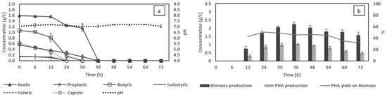 As seen in Figure 4b, by comparing the biomass production and PHA accumulation induced by the changes in pH, the difference can be clearly observed from 36 h onwards. At 30 h, the pH in the no control assays reached 8.2 (an 18% offset from the initial pH level) (Figure 3b). This deviation was hypothetically considered to have a strong impact on the bacterial activities, thus lowering the overall VFA consumption. The acetic acid content under no pH control condition remained at 0.9 g/L compared to 0.3 g/L in the pH control counterpart at 36 h. Under unfavourable pH conditions, the microbial metabolism is constrained due to the changes in enzymatic structure which promote destruction and wrecking activity, ultimately leading to the delay in carbon source consumption (VFA assimilation, for instance) [39]. Furthermore, the energy produced from the VFA utilisation, is in this case possibly directed to cell maintenance rather than cell growth, thus preventing cell lysis [40]. Therefore, regardless of reaching the maximum biomass production at 36 h, the biomass obtained in controlled pH condition was 2.8 g/L which was significantly higher than the amount in the culture with no pH control (1.9 g/L). The difference in biomass production, as a consequence, leads to a deviation in PHA accumulation, the concentration of which in fixed pH reactor was higher than no pH control, being respectively 1.5 g/L compared to 1.3 g/L (Figure 4a,b). PHA yield on biomass obtained in the uncontrolled pH assays, on the other hand, was higher as soon as the pH was shifted away from the optimal level. It could be hypothesised that unstable pH is a stress factor which suppresses the bacterial growth, thus triggering PHA accumulation.