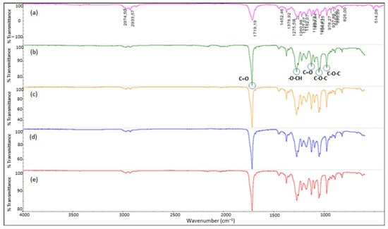 Fourier Transform Infrared Spectroscopy (FTIR) spectra from extracted polyhydroxyalkanoate (PHA) produced by C. necator DSM 545 using different carbon sources and for poly(β-hydroxybutyrate-β-hydroxyvalerate) (PHBV) commercial pellet: (a) PHBV pellet, (b) glucose, (c) synthetic volatile fatty acids (VFAs) (ammonium sulfate), (d) synthetic VFAs (urea), and (e) real VFA stream.