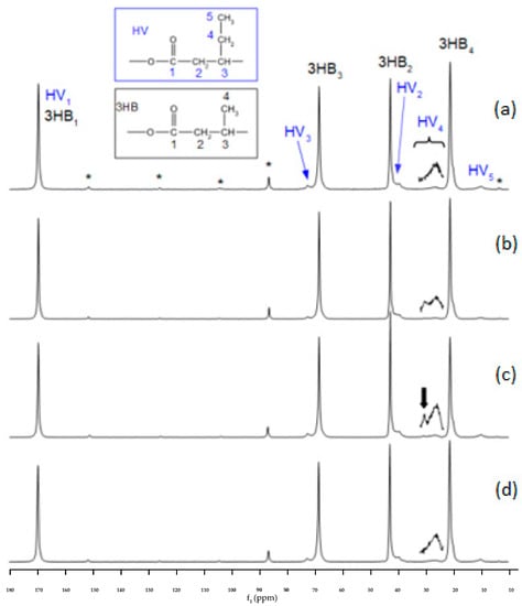 The side chain CH2 carbon peak HV4 from HV, around 27 ppm in the spectra, is frequently seen as asymmetric and, at this low HV content, has been assigned to crystalline HV with different arrangements of the HV side chain in the PHB lattice and amorphous HV [72]. It has also been suggested that at this low level of HV, there is no or little crystalline form of HV present [70,73]. This asymmetric peak is observed for all the samples analysed here. In addition, for two of the samples (VFA/urea and VFA/glucose), there is also a weak peak around 30–31 ppm (indicated by an arrow in Figure 8). When the level of HV is over 30–40%, a peak near this area (29–30 ppm) has been assigned to HV in a crystalline PHV lattice [70]. However, the level of HV in these samples is only 4–8% and at this low level, this crystalline form of HV is not normally observed. In addition, the peak observed here displays a slightly higher chemical shift than normally seen for crystalline HV in a PHV lattice.