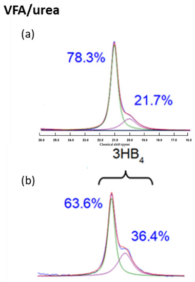 Figure 9 shows an expansion of the HB methyl peak area from the CPMAS NMR experiment together with the direct excitation MAS NMR experiment. This methyl peak has both a broader and narrower component. The narrow component is assigned to PHB in more ordered areas, presumably the crystalline regions, while the broader component is assigned to PHB in the less ordered, amorphous regions [69,70,71] (see also Supplementary Material). The ratio of these two components found in the CPMAS NMR experiment was corrected for the CP dynamics by comparing the CP spectrum of the VFA/urea sample with the quantitative single pulse experiment shown in Figure 9. This correction factor was used to estimate the degree of crystallinity for the other samples where only CPMAS NMR spectra were measured. The deconvolution of the methyl peaks depends on the peak lineshapes used (Lorentzian/Gaussian) for fitting, but in this case all four samples were fitted with the same lineshapes so the relative amounts of crystalline/amorphous should be comparable.