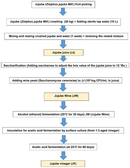 Jujube vinegar was produced by the ethanol and acetic acid fermentation stages according to the traditional vinegar production technique []. The production flow diagram is given in Figure 1. Jujube fruits were harvested from the jujube plant. Jujube (Ziziphus jujuba Mill.) fruits were selected from non-bruised, intact fruits. The fruits were carefully rubbed and washed. The fruits were cut into pieces and filled into jars and the jars were filled with sterile tap water, and their lids were closed. The jars were agitated from time to time without opening their lids. The jars were kept at +10 °C for one week. Jujube juice (JJ) was obtained by filtering the mixture with cheesecloth. The °Brix was adjusted to 12 °Bx by adding sugar to the JJ. Then, alcohol fermentation was initiated by adding yeast (Saccharomyces cerevisiae) to the JJ. Alcohol fermentation was carried out at 25 °C for 30 days. At the end of the period, jujube wine (JW) was obtained, which was both a by-product and a raw material for the second stage of the fermentation. For acetic acid fermentation, aged vinegar was inoculated (1/3 ratio). Acetic acid fermentation lasted 60 days at 25 °C for jujube vinegar (JV). The jujube vinegar production was repeated in two parallel, and three replications. All analysis were carried out in two parallels.