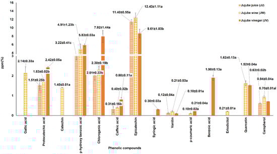 Phenolic compounds of jujube juice (JJ), jujube wine (JW), jujube vinegar (JV) (ppm). Different letters in the figure indicate significant differences between samples.
