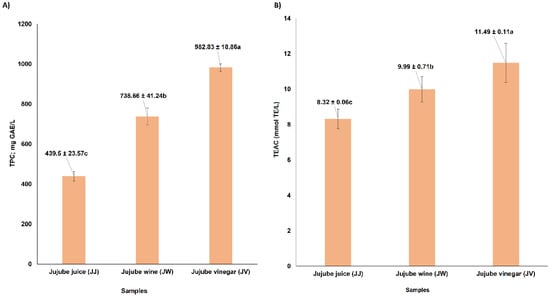 Examining the total phenolic content and antioxidant activity, there was a close relationship in the samples of jujube juice and jujube vinegar. Sorting the TPC and TEAC values from high to low, it was determined to be jujube vinegar, jujube wine, and jujube juice (p < 0.05). The TPC value was 982.83 mg GAE/L while the TEAC value was 11.49 mmol TE/L in the JV samples.