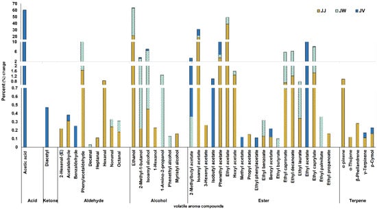 In the study, a total of 42 volatile compounds including 19 esters, 9 aldehydes, 7 alcohols, 5 terpenes, 1 acid, and 1 ketone were determined. Examining the JJ (32 compounds), JW (22 compounds), and JV (19 compounds) samples together (Table 4 and Figure 4), in the JJ sample, the total ester ratio had the highest value with 66.4%, followed by the alcohols, aldehydes, and terpenes with 3.58% and 22.2%, and 1.65%, respectively. In another study, a total of 46 volatile compounds, including aldehydes, alcohols, alkenes, ketones, esters, and acids were detected in the aroma component analysis of fresh jujube fruit [].