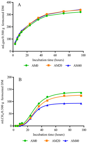 The lower accumulated gas production shown in AM0 and AM20 (Table 4 and Figure 1A) is probably due to the higher digestibility and better utilization of nutrients (mainly protein), in response to the biological value of the feed components (rich in highly fermentable carbohydrates) [42]. In this context, Blümel et al. [53] proposed that the total volume of gas produced is inversely proportional to substrate digestibility and microbial protein synthesis. As evidenced in the present study in AM40 with the highest total gas production and lower digestibility (Table 3 and Table 4), this is probably due to poor protein utilization and lower microbial protein synthesis in response to the limited access of microorganisms on the fibrous component of the substrate, and the reduced ability of enzymes to access protein (complex tannin/nutrient; protein and fiber) [53]. Barros-Rodríguez et al. [54] found the same trend and showed that the greater production of total gas was associated with a lower synthesis of microbial proteins.