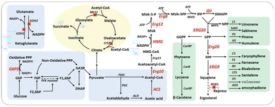 - Shiba, Y.; Paradise, E.M.; Kirby, J.; Ro, D.-K.; Keasling, J.D. Engineering of the pyruvate dehydrogenase bypass in Saccharomyces cerevisiae for high-level production of isoprenoids. Metab. Eng. 2007, 9, 160–168. [Google Scholar] [CrossRef]