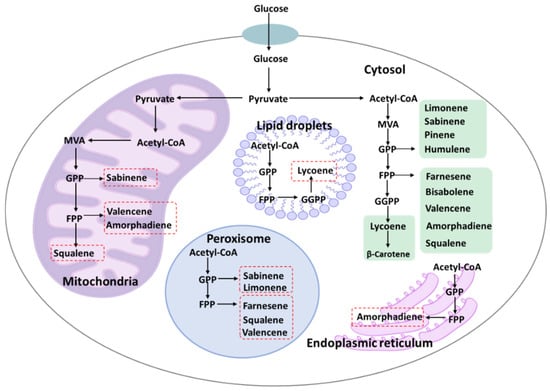 - Jia, H.; Chen, T.; Qu, J.; Yao, M.; Xiao, W.; Wang, Y.; Li, C.; Yuan, Y. Collaborative subcellular compartmentalization to improve GPP utilization and boost sabinene accumulation in Saccharomyces cerevisiae. Biochem. Eng. J. 2020, 164, 107768. [Google Scholar] [CrossRef]