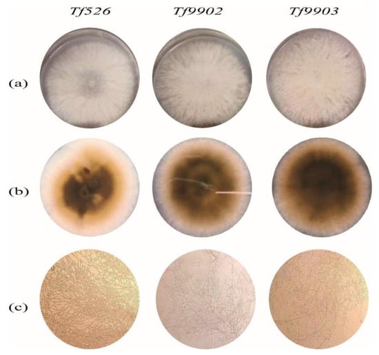Microscopic observation of three strains of Tremella fuciformis (Tf526, Tf9902, Tf9903) on the solid culture plate. (a) Front view of Tremella fuciformis (Tf526, Tf9902, Tf9903) on a culture plate. (b) Back view of Tremella fuciformis (Tf526, Tf9902, Tf9903) on a culture plate. (c) Mycelium micro examination (200×) of Tremella fuciformis (Tf526, Tf9902, Tf9903) obtained by liquid culture.