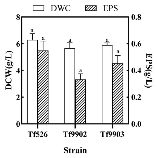 Strain selection for the high yield of EPS and DCW production. Data are expressed as mean ± SD, n = 3. Values with no letters in common are significantly different (p < 0.05).