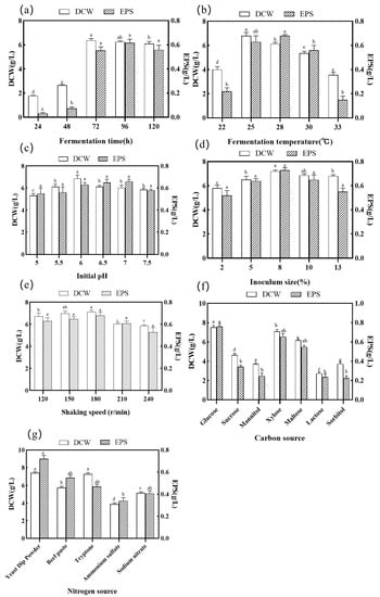 Effects of each variable factor on the yield of EPS and DCW from Tf526 strain: (a) culture time; (b) culture temperature; (c) Initial pH; (d) Inoculum size; (e) shaking speed; (f) Carbon source; (g) Nitrogen source. Data are expressed as mean ± SD, n = 3. Values with no letters in common are significantly different (p < 0.05).