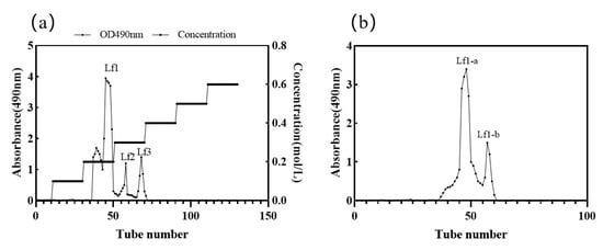 Chromatography purification of TEPS: (a) TEPS fraction of Lf1, Lf2, and Lf3 using stepwise elution on DEAE-Sepharose FF column (20 mm × 100 cm, 1.25 mL/min); (b) Lf1-a and Lf1-b TEPS from Lf1 subsequently obtained on Sephacryl S100 column (10 mm × 60 cm, 0.5 mL/min).