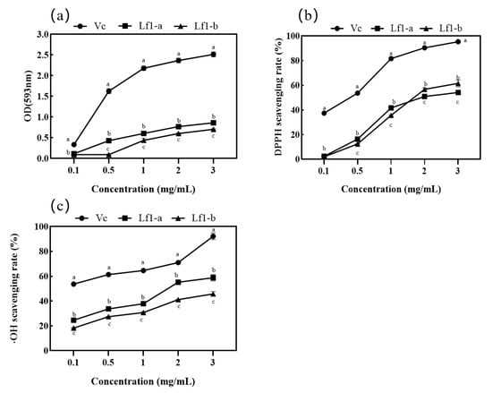 In vitro antioxidant capacity of Lf1-a and Lf1-b: (a) Reduction capacity; (b) DPPH scavenging activities; (c) Hydroxyl radical scavenging activities. Data are expressed as mean ± SD, n = 3. Values with no letters in common are significantly different (p < 0.05).