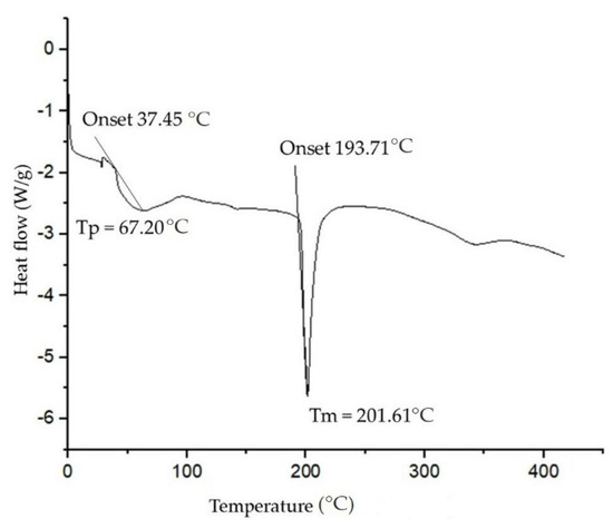 The BE DSC thermogram shown in Figure 5 revealed a thermal phenomenon close to 68 °C and an accentuated thermal transition within the temperature range of 200–210 °C. At initial temperatures, the occurrence of thermal events is common, possibly due to the evaporation of solvents or some compounds present in the sample. As previously described, the BE from this study was previously isolated from the fermentation medium by ethanol precipitation, so it is suggested that at 68 °C the evaporation of residual ethanol molecules could be present in the sample. The melting temperature (Tm) was observed at 201.61 °C, which suggests the decomposition of the components present in the BE.