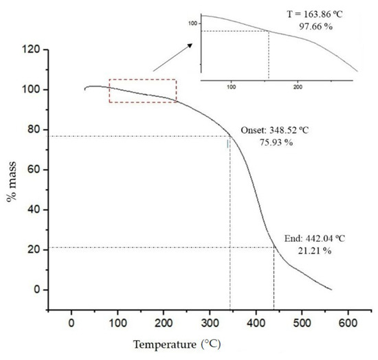 Thermostability analysis of BEs allows us to verify the possible applications that these molecules can play. Thermogravimetric analysis was performed in the range of 30–700 °C. As seen in Figure 4, for the BE produced there were three points of thermal degradation. Initially, a mass loss of approximately 2.34% was observed at 150–170 °C. This loss can be attributed to the dehydration of the sample. With increasing temperature, the mass remained constant until the temperature reached 348 °C. From that point on, mass loss began to occur, which is likely associated with the decomposition of proteins and polysaccharide side chains. In this temperature range, between 348–450 °C, a mass loss of 55% was detected. At temperatures above 450.0 °C, a gradual loss of mass was observed, which can be attributed to the degradation of residual material. Similar behavior was observed for the BE produced by Pseudomonas putida NRRL B-14875, composed of 19.5% (w/w) lipids, 21.9% of proteins, and 11.5% of carbohydrates. Initial dehydration occurred between 35.0–103.5 °C, with a weight loss of 5.1%. At temperatures between 283.6–460 °C a mass loss of 46.76% was observed. After this, temperatures between 470–675 °C, caused a mass loss of 15.5% [63].