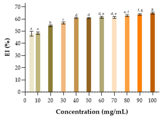 The effect of concentrations of BE on the stability of the emulsion was determined by mixing different concentrations of BE with kerosene. BE solutions with different concentrations (100; 90; 80; 70; 60; 50; 40; 30; 20; 10; 5; 2.5; 0.5; and 0.1 mg/mL) were prepared in Falcons tubes. The tubes were mixed by vortexing at 9000 rpm for 2 min and incubated at room temperature for 24 h. The emulsion was maintained for EI24 analysis (Section 2.12). The tests were performed in triplicate.