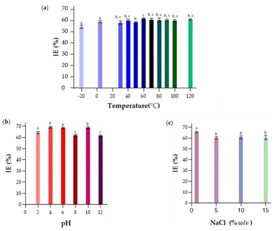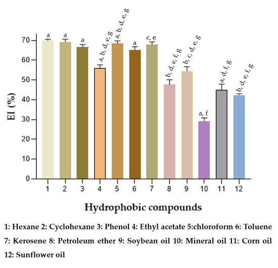 The effect of thermal stability, pH, and salinity on the emulsifying properties of BE were evaluated by mixing 40 mg/mL of the extracted BE solution and kerosene. For thermal stability, emulsions were prepared and kept at determined temperatures (ranging from −20 to 121 °C) for 15 min, and then kept at room temperature. To evaluate the influence of pH, its values were adjusted using 1.0 mol/L NaOH or HCl in extracted BE solution before mixing it with kerosene. The effect of salinity was considered with different concentrations of monovalent salt (NaCl 5–15% w/v) until complete dissolution [39]. The concentration of NaCl in the BE solution was adjusted, and then the emulsions were formed. The emulsion was maintained for EI24 analysis (Section 2.12). The tests were performed in triplicate.