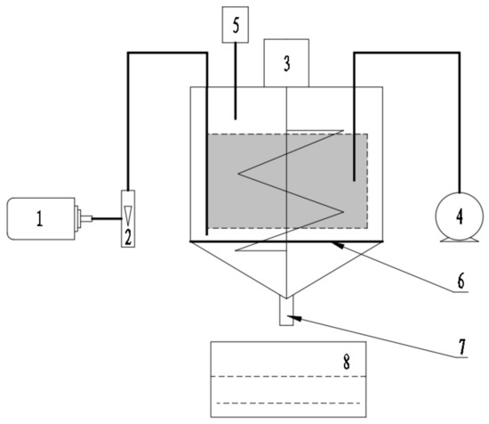 Schematic diagram of composting reactor. 1. Aeration fan, 2. gas flow meter, 3. stirring motor, 4. temperature monitoring, 5. gas collection, 6. sieve plate, 7. leachate outlet, 8. leachate collection.