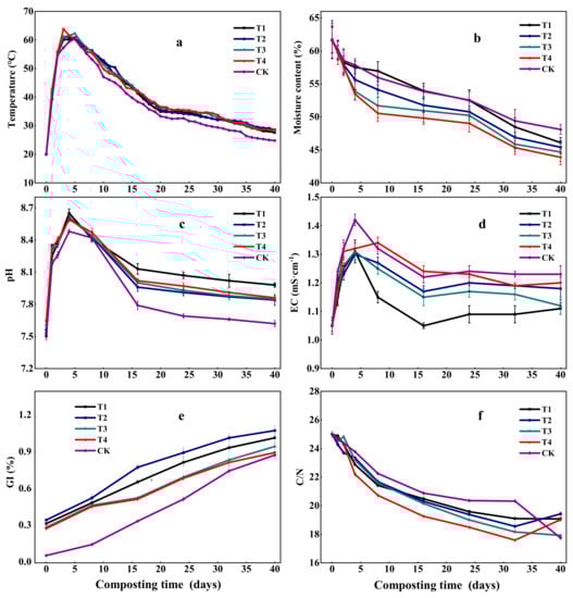 Variations of temperature (a), moisture content (b), pH (c), EC (d), GI (e), and C/N (f) of different treatments during the composting process.