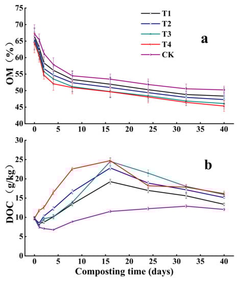 Variations of OM (a) and DOC (b) of different treatments during the composting process.