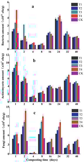 In the middle-temperature stage of aerobic composting, bacteria of all kinds of flora have a key role in the enhancement of pile temperature. The effect of biochar on bacteria in the composting process is shown in Figure 4a. The number of bacteria reaches the peak in the warming and cooling periods, and decreases in the high-temperature period. In the first 8 days of composting, the bacterial population of each treatment is T4 > T3 > T2 > T1 > CK, and the highest bacterial population is 4.98 × 1011 cfu/g at first day in the T4, manifesting that the microporous structure and microporous environment possessed by biochar confer favorable conditions for bacterial growth and reproduction [44]. During the warming stage, the number of mesophilic bacteria rises on account of them using easily degradable OM, such as crude protein and soluble monosaccharides, for their own physiological activities. In the high-temperature stage, due to the high temperature and the gradual reduction in nutrients, mesophilic bacteria enter into an inactive or dormant state, resulting in a decrease in the number of bacteria. Subsequently, in the cooling stage, the compost temperature once again provides a suitable environment for the growth of microorganisms, and the rebound of the number and activity of mesophilic bacteria has a catalytic effect on the improvement in the degree of humification. From the late stage to the end of composting, the rate of OM degradation gradually slows down and cannot reach the needs of bacterial growth, leading to a decrease in the number of bacteria [45].