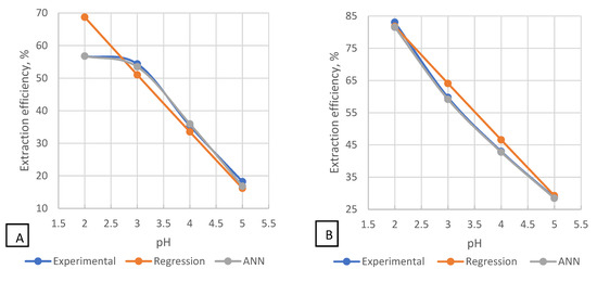 A comparison between the experimental data, the statistical regression model’s predictions, and the ANN (4:50:1) model for a concentration of ALA-2 of 40 is presented in Figure 9. As observed, the regression model does not efficiently capture the efficiency dynamic and tends to be linear. On the other hand, the ANN predictions are closer to the experimental data. Moreover, there is a single ANN that models all the cases, and there is no need to change the relation based on the initial conditions. However, in terms of predicted values, especially at low pH, for n-heptane, the predicted values for the regression are far from the experimental data.