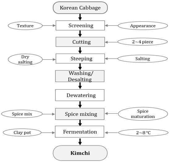 Kimchi is one of Korea’s signatory fermented foods prepared using various vegetables, including cabbage, fruits, and other ingredients. There are different types of kimchi depending on the raw materials and salting method. The preparation of good kimchi depends on the raw materials used, as these raw materials contain microorganisms needed for the fermentation process []. Additionally, the use of red peppers adds a unique taste to the kimchi, and its usage is unique to Korea [].