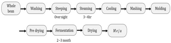 Meju is the basic material for making jang. Traditionally, meju is made by allowing numerous microbes to naturally proliferate at high temperatures, and these microorganisms can decompose the soybean proteins. Thus, the fermentation state of meju is closely related to the quality of the final jang. Figure 3 depicts the meju preparation process [].