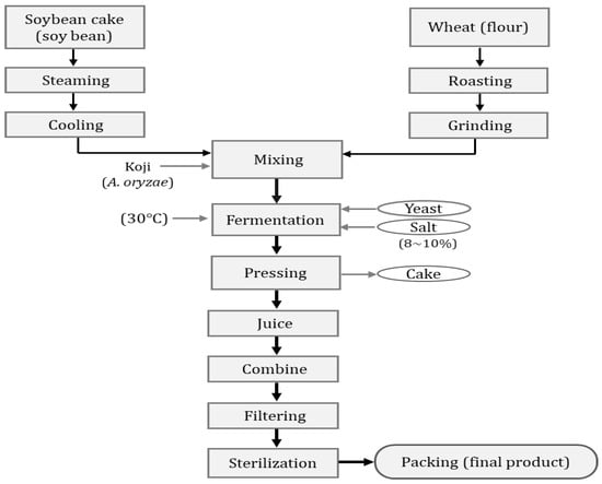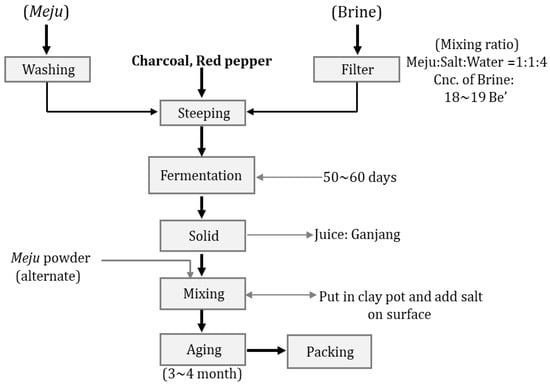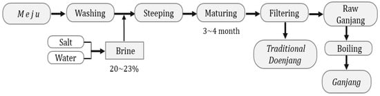 Doenjang is another food product made from soybean, and is traditionally used in Korea as a basic seasoning. In the market, doenjang is produced in two ways: one is traditional, and the other is a modified method []. Traditionally, doenjang is prepared by immersing meju in a brine solution and allowed to ferment for at least 6 months, then separated the remaining meju chunks. The filtrate becomes traditional ganjang. Traditionally, doenjang is prepared by the fermentation of cooked and mashed chunks with meju powder, ganjang, and steamed rice or barley in a clay pot. Specific microbes are inoculated to alter the fermentation process in the modified method. Ganjang is obtained as a byproduct of doenjang. Traditional doenjang has a unique and strong flavor. However, doenjang prepared using a modified method has a mild flavor. Traditional doenjang contains a relatively high salinity level, and efforts are being made to lower salinity without affecting the shelf life. The traditional and modified doenjang production is illustrated in Figure 6 and Figure 7, respectively.