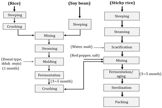 The addition of gochujang meju powder prior to fermentation and the use of malt extract to saccharify starch from grains are signatory processes during the preparation of gochujang. Gochujang preparation is characterized by long fermentation in a clay pot with an increased amount of red pepper powder. Sikhye gochujang is a traditional gochujang made with malt extract to break down the starch in rice and other grains, which produces a sweet taste. The modified process of preparing gochujang is presented in Figure 9 [].