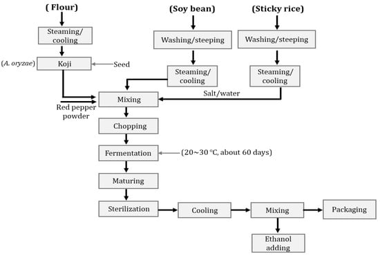Gochujang is a unique seasoning, and it is not only an item that can store well, but is also a spice-fermented seasoning that is differentiated due to its originality, such as its characteristic spicy taste and aroma. Red pepper and mustard are used as main ingredients worldwide, but several kinds of red peppers are also one of the most widely used spices. In particular, red pepper is differentiated by its refreshing, spicy taste and have recently been in the spotlight as a popular diet food worldwide. Along with kimchi, the perception of gochujang, a traditional Korean spicy food, is expected to change considerably. Figure 8 illustrates the general manufacturing process of traditional gochujang [].