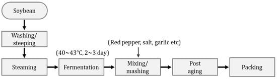 Cheonggukjang is another fermented product produced from soybeans, and uses the power of bacteria to decompose the soybean protein []. Cheonggukjang is fermented at a high temperature (40–43 °C) for a short duration (2~3 days). In most cases, the bacterial composition is utilized to aid the cheonggukjang fermentation process. Bacillus natto is used to prepare Japanese natto, a fermented product from Japan similar to cheonggukjang. However, Bacillus subtilis is a bacteria commonly used to prepare cheonggukjang []. Cheonggukjang has a distinct fermentation odor and is consumed in the form of a stew or soup. However, cheonggukjang is unpopular among the young Korean generation owing to its distinct fermentation odor. Nonetheless, if this odor is refined or altered, then cheonggukjang can be developed as a favorite side dish worldwide. Figure 10 represents the manufacturing process for traditional cheonggukjang [].