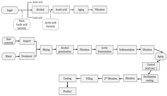 The process of vinegar fermentation is as simple as other fermented products in Korea. Fruits do not require the saccharifying process and can be used directly for vinegar preparation. However, grains should pass a saccharifying process triggered by yeast. Firstly, alcohol is produced through fermentation, and the alcohol produced is utilized to create acetic acid using acetic acid bacteria. The traditional preparation process for vinegar is presented in Figure 12. Various types of vinegars with different tastes and aromas are produced using different raw materials.