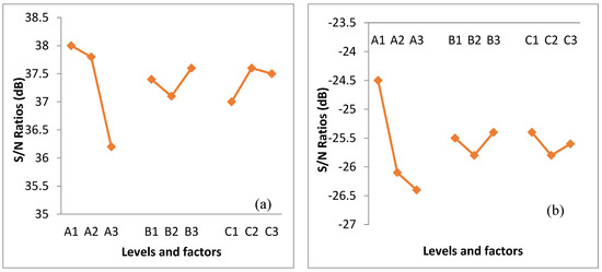 Alkali extraction was performed in 2000 mL beakers containing different concentrations of NaOH solution with 1:8 solid-to-liquid ratio [5]. Three factors, concentration of sodium hydroxide (NaOH), extraction time, and temperature, were observed for their influence on optimized steam-exploded fibers (Table 1). The alkali extraction conditions were augmented by a Taguchi experimental design, and the three factors of an L9 (33) orthogonal array were selected (Table 2). In this study, the optimum conditions were expressed in terms of “the larger-the-better” for cellulose and “the smaller-the-better” for lignin, and the S/N for these attributes were assessed by using Equations (1) and (2), respectively: