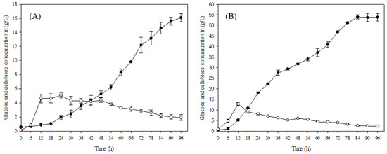 Enzyme hydrolysis of oil palm frond (A) before pretreatment (raw material) and (B) after pretreatment: (●) glucose concentration and (○) cellobiose concentration in g/L.