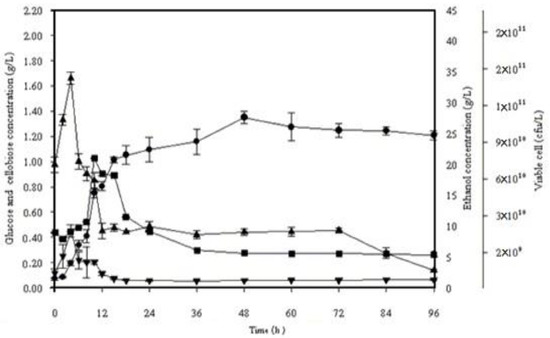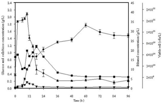 The concentrations of ethanol, glucose, and cellobiose were determined by high performance liquid chromatography (HPLC A5333, KNAUER, Berlin, Germany) using an Aminex HPX-87H column at 50 °C. Sulfuric acid (0.005 M) was used as mobile phase with a flow rate of 0.6 mL/min [34].