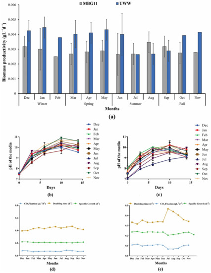 - Kushwaha, D.; Upadhyay, S.; Mishra, P.K. Growth of cyanobacteria: Optimization for increased carbohydrate content. Appl. Biochem. Biotechnol. 2018, 184, 1247–1262. [Google Scholar] [CrossRef]