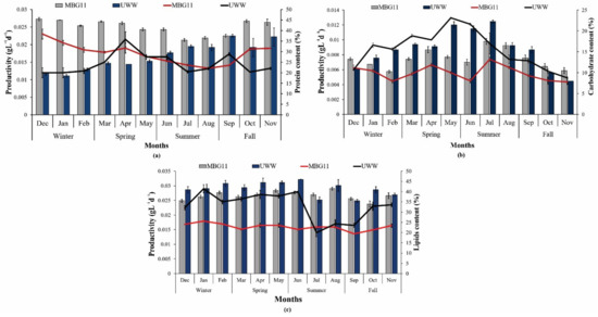 - Sutherland, D.L.; Ralph, P.J. Productivity and community response along an ammonia gradient in cultured wild marine microalgae, using wastewater-derived nutrients for cost-effective feedstock production. J. Appl. Phycol. 2021, 33, 2933–2945l. [Google Scholar] [CrossRef]