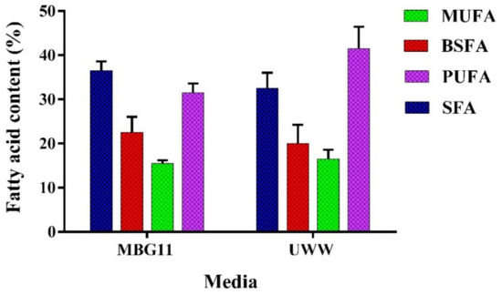 - Yalcin, D. Growth, lipid content, and fatty acid profile of freshwater cyanobacteria Dolichospermum affine (Lemmermann) Wacklin, Hoffmann, & Komárek by using modified nutrient media. Aquac. Int. 2020, 28, 1371–1388. [Google Scholar] [CrossRef]