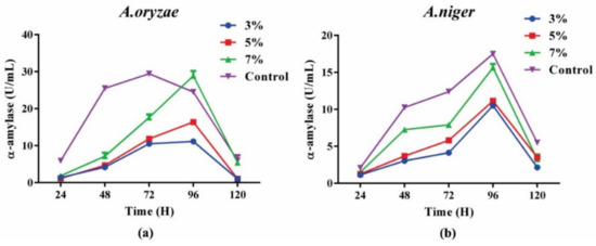 - Hernández, M.S.; Rodríguez, M.R.; Guerra, N.P.; Rosés, R.P. Amylase production by Aspergillus niger in submerged cultivation on two wastes from food industries. J. Food Eng. 2006, 73, 93–100. [Google Scholar] [CrossRef]