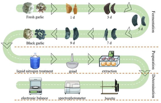 The workflow of this study is shown in Figure 1. Samples were taken every other day during the fermentation of BG. The samples were treated with liquid nitrogen first. Then, the samples were ground. Finally, extraction was conducted according to the method mentioned below. We determined the contents of various ingredients in samples. The data we obtained were analyzed statistically. We classified the differences between black garlic and fresh garlic into three aspects: sensory, physicochemical properties, and bioactive functions.