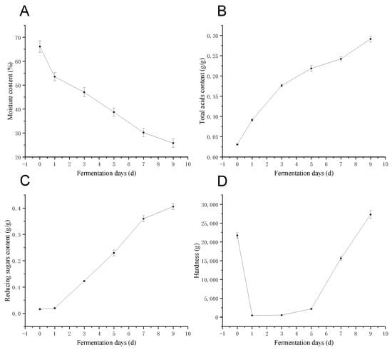 The change of moisture content (A), total acids content (B), reducing sugars content (C), and hardness (D) during BG fermentation. All data were expressed as mean ± standard deviation (SD).