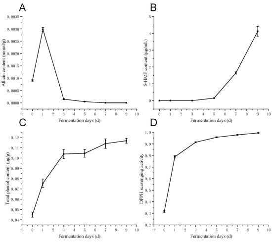The change of allicin content (A), 5-HMF (5-Hydroxymethylfurfural) content (B), total phenols content (C), and antioxidant properties of black garlic (DPPH scavenging activity) (D) during the fermentation. All data were expressed as mean ± standard deviation (SD).