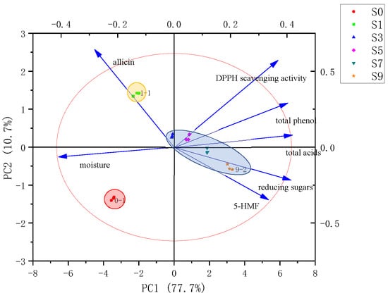The obtained PCA biplot is shown in Figure 4. It can be observed from the figure that the two principal components explained 88.4% of the total variability, of which PC1 was the most significant, explaining 77.7% of the total variability. A significant separation caused by the fermentation time was observed along PC1, especially the separation of the samples at the beginning of the fermentation from the later stages of the fermentation. What influenced PC1 positively were DPPH scavenging activity, total phenol, total acids, reducing sugars, and 5-HMF. Their concentrations discriminated BG in the later stages of production from the rest of the fermentation times. PC2 also affected the separation of FG and samples at the beginning of fermentation. In this case, allicin and moisture scored the highest, indicating that the separation of S0 and S1 samples was mainly caused by changes in allicin and moisture content. In contrast, these two compounds were the only compounds with negative values in PC1. Obviously, the samples can be grouped into three clusters, including cluster1 (fresh garlic, S0), cluster2 (S1), and cluster3 (S3−S9), respectively. This showed that the BG during fermentation was mainly divided into three stages by the changes of physicochemical properties, which included FG (unfermented), initial fermentation, and late fermentation. It is conducive to the formation of a better quality of BG by proper adjustment of production conditions.