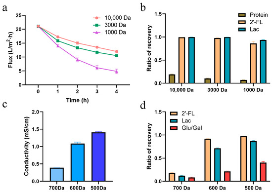 After impurity removal of the first two filter membranes, the function of the third filter membrane was to intercept the target product 2′-FL, remove the substrate lactose with a molecular weight lower than the target and other monosaccharides such as glucose and galactose, and remove most of the small molecules of inorganic salts. Since the molecular weight of target 2′-FL is 488.44, a membrane with a molecular cutting weight slightly greater than the molecular weight of the target was chosen. The experimental results (Figure 2c) showed that the 500 Da membrane had the best retention effect, with a recovery ratio of more than 97%, but at the same time, the residual ratio of lactose was 86.4%, which could only remove a small amount of lactose. Meanwhile, the conductivity is also higher than the membrane with a larger molecular weight, indicating that more inorganic salts are retained. The 600 Da filter membrane had a better effect on removing small molecular impurities such as lactose and inorganic salts than the 500 Da filter membrane, at the cost of losing a part of the product recovery (about 5%). Filter membranes with a higher molecular weight of retention, such as 700 Da, had a worse retention effect on products and lactose and could hardly intercept products (about 18.5%). Therefore, 600 Da and 500 Da had better effects in this experiment. The difference was that 500 Da had a better product retention effect, and 600 Da had a better impurity removal effect. The specific selection needed to be comprehensively considered in combination with the subsequent purification steps.