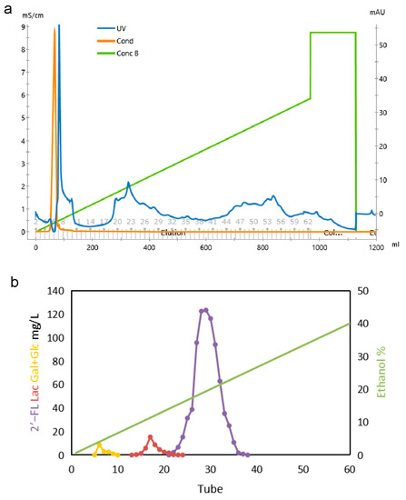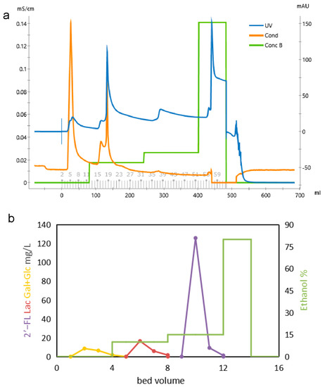 The results of linear ethanol elution are shown in Figure 3a. The component with the highest conductivity was collected in tubes 5–7, and the component with the highest UV280 response value was collected in tubes 6–10. It indicated that the main impurities in the sample solution, inorganic salts and proteins, were first eluted. Subsequently, with the increase of ethanol concentration, other substances with absorption peaks at 280 nm were eluted. The elution results of product 2′-FL and other sugars are shown in Figure 3b. Glucose and galactose were detected in tubes 6–9, while the ethanol concentration was 4–6%, and the elution width was 1 bed volume (BV). Lactose was detected in tubes 14–23 with 9.3–15.3% of the elution concentration and 2.2 BV of the elution width. The product 2′-FL was detected in tanks 22–37; in the meantime, the ethanol concentration was 14.7–25.7%, and the elution width was 3.4 BV. Therefore, we think that the ethanol elution concentration of monosaccharide is 4%, that of lactose is 9.3%, and that of 2′-FL is 14.7%.
