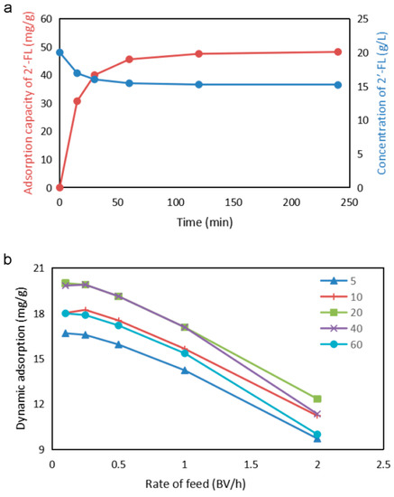 Static adsorption and dynamic adsorption results of activated carbon. (a) Static adsorption; (b) dynamic adsorption on the feed concentration of 2′-FL with 10 g/L.