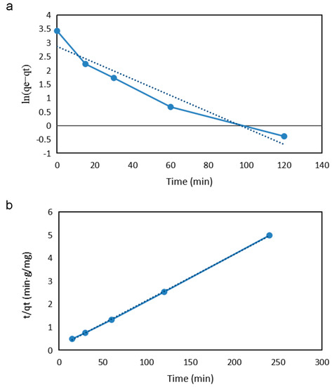 Linearized data of the pseudo-first-order kinetic model and the pseudo-second-order kinetic model. The solid line in this figure is the connecting line of the measured value, and the dotted line is the fitting straight line. (a) The pseudo-first-order kinetic model; (b) The pseudo-second-order kinetic model.