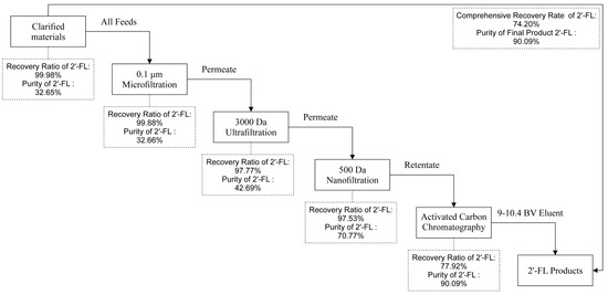 For the fermentation industry, especially for the products whose titer is difficult to improve, simplifying the purification process represents a high recovery ratio and low production cost. However, a single purification process is often difficult to meet the basic qualification requirements, or it is necessary to sacrifice the product recovery ratio to significantly increase production costs. We tried to purify 2′-FL only by membrane filtration. After multi-stage purification, we could get a product with a purity higher than 95%, but the recovery ratio was less than 1% (data not shown). Therefore, it is the best choice to combine with other methods of refining oligosaccharides to obtain high-quality products. Figure 8 shows the flow chart of the best purification process and the recovery ratio and product purity of 2′-FL after each process treatment in this study.